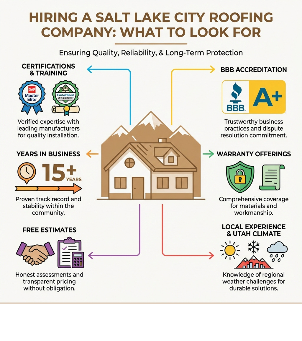 Most Salt Lake City roofing companies offer residential and commercial services, including repairs, replacements, and maintenance. The best contractors hold certifications like GAF Master Elite or CertainTeed SELECT ShingleMaster, maintain strong BBB ratings, and offer clear warranties on both materials and workmanship.